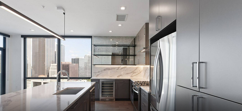 East Quarter, located in the heart of Dallas, these beautiful apartments are ready for you. AIS provided frameless melamine cabinets in Campania and Dark Grey finishes. Look at the kitchen- Luxury & Modern.